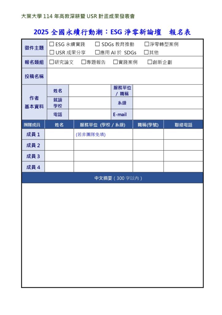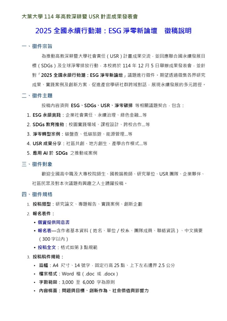 【活動報報】大葉大學辦理【114年度高教深耕/USR計畫成果發表會】活動暨「2025全國永續行動潮:ESG淨零新論壇」議題進行徵稿
