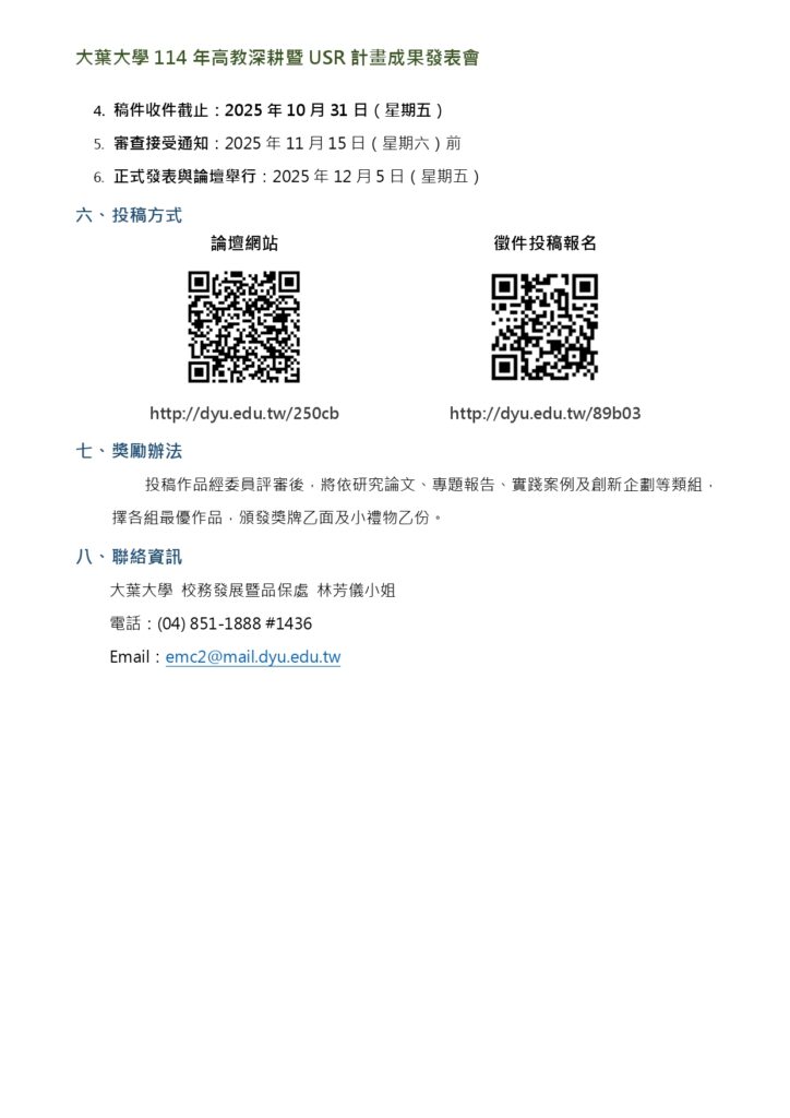 四、聯絡人:校務發展暨品保處林芳儀小姐、蘇辰宇先生,聯絡電話:04-8511888轉1436、2363,Email:emc2@mail.dyu.edu.tw