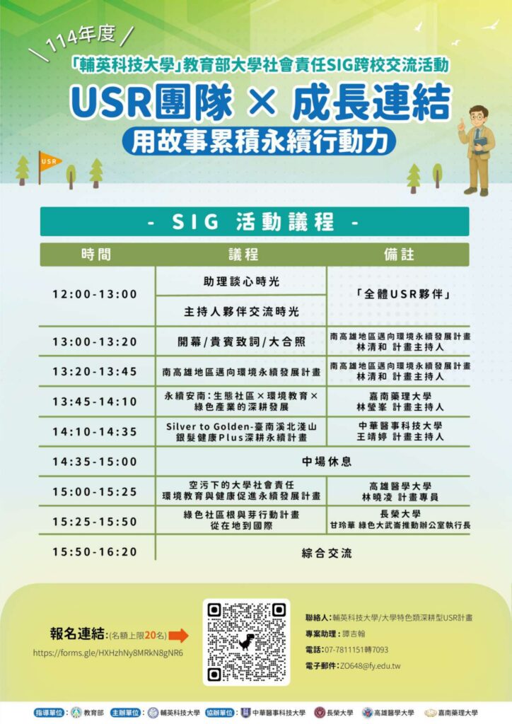 一、活動主題:「本次USR跨校交流以「USR團隊x成長連結x用故事累積永續行動力」為主題,邀請主持人、成員與助理分享計畫經驗與挑戰。特別規劃「助理談心時光」,讓助理交流甘苦與收穫。透過故事、互動與跨校合作,凝聚USR夥伴關係,共同推動永續發展與在地連結。