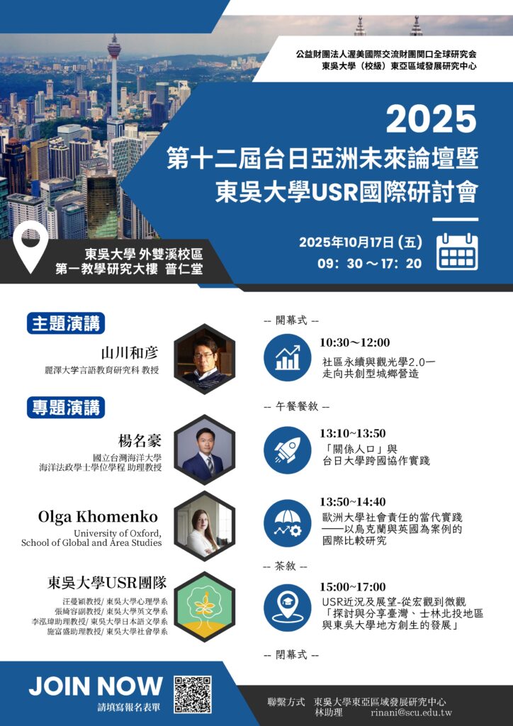 一、「第十二屆台日亞洲未來論壇暨2025東亞區域發展研究中心USR國際研討會」,資訊如下: (一)主題:以「大 […]