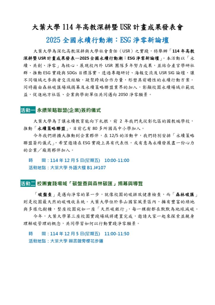 【活動報報】大葉大學舉辦「114年度高教深耕/USR計畫成果發表會」及「2025全國永續行動潮:ESG淨零新論壇」議題徵稿活動