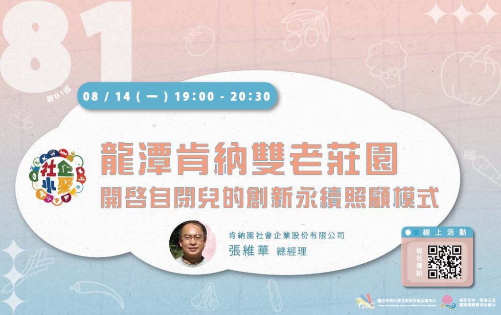 [活動抱抱]中央大學辦理「桃園社企小聚:龍潭肯納雙老莊園:開啟自閉兒的創新永續照顧模式」