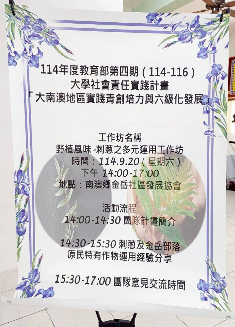 由「大南澳地區實踐青創培力與六級化發展」計畫主持人陳怡伶老師至南澳當地金岳部落討論原民植物刺蔥之應用,其中展示計畫今年度相關成果及團隊簡介,於未來將開發刺蔥相關產品,南澳鄉金岳部落發展協會總幹事陳芃伶講解在地原民特有作物經驗分享及產品開發,接者請計畫中成員宜蘭青農御品蓮休閒農莊陳春男業者有機作物種植分享經驗,這過程中教育、在地、業界方三者合一探討今日的刺蔥農業及產品規劃應用,相信此產品未來定是能大放異彩。