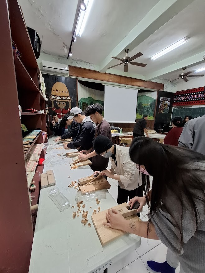 首先金岳部落社區深度部落導覽,由在地青年解說員帶領,步行約1.5小時,了解部落遷徙、舊部落故事與泰雅文化,第一站由解說員介紹金岳社區地圖,第二站參觀原民傳統房屋,第三站瞭解「莎韻之鐘」背後故事起源,第四站參訪原民當地生活故事與背景。 下午課堂由花蓮農工謝仁壽老師及林瑞祥老師教學推動原民部落國產材活化在應用,帶領學員認識原住民以及非原民木工工具教學,續以實作體驗指導各學員國產木材的木餐具製作、國產材的暖心燈製作,每個學員今日收穫滿滿。